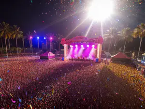 Adembenemende luchtfoto van een groots opgezet muziekfestival in tropische setting. Het imposante podium met roze lichtshow en decoratieve elementen wordt omringd door palmbomen. Een massale menigte festivalgangers geniet onder de sterrenhemel, terwijl kleurrijke confetti door de lucht dwarrelt. perfect voor promotie van evenementen en festivals.