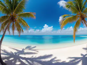 Adembenemend tropisch strandparadijs met wuivende palmbomen die hun schaduw werpen op het hagelwitte zandstrand. Het kristalheldere turquoise water en de strakblauwe hemel met witte wolken creëren een perfect vakantietafereel. Deze professionele natuurfoto is ideaal voor reisbrochures, wanddecoratie of vakantiemarketing.