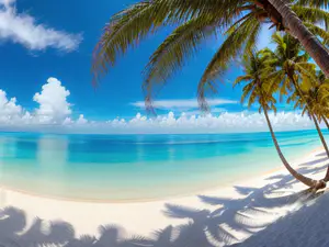 Adembenemend tropisch strand met wuivende palmbomen die hun schaduw werpen op het spierwitte zand. Het kristalheldere turquoise water vormt een perfect contrast met de strakblauwe lucht en witte wolken. Een idyllische locatie die het ultieme vakantiegevoel oproept en perfect is voor reisbrochures of vakantiemarketing.