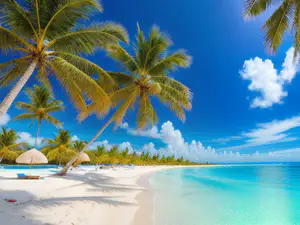 Adembenemend tropisch strand met wuivende palmbomen en kristalhelder turquoise water. Het witte zandstrand met rieten parasol biedt de perfecte setting voor een ontspannen strandvakantie. De helderblauwe lucht met enkele witte wolken maakt het paradijselijke plaatje compleet. Ideaal voor reisbrochures en vakantiemarketing.