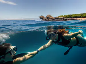 Spectaculaire split-shot opname van snorkelaars in kristalhelder turquoise water, met boven water een indrukwekkende rotsformatie en tropische kustlijn. De foto combineert perfect de onderwaterwereld met het landschap erboven, wat resulteert in een dynamische compositie die de schoonheid van maritieme activiteiten vastlegt.