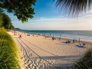 Idyllisch tropisch strand met goudgeel zand en azuurblauwe zee, omlijst door wuivende palmbladeren. Het uitgestrekte zandstrand biedt ruimte aan strandgangers die genieten van een ontspannen dag aan zee. De natuurlijke setting met weelderige vegetatie en heldere horizon creëert een perfect vakantielandschap voor zowel rust als recreatie.