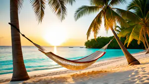 Idyllische strandscène met een uitnodigende hangmat tussen twee palmbomen bij zonsondergang. Het kristalheldere turquoise water, het hagelwitte zandstrand en de gouden gloed van de ondergaande zon creëren de perfecte setting voor ultieme ontspanning. Een authentiek beeld van tropische luxe dat perfect past bij reisbrochures en vakantiemarketing.