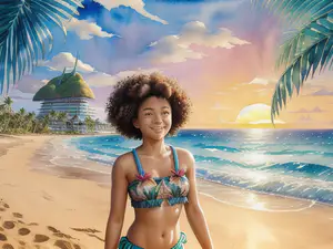 Idyllische tropische strandscène tijdens een betoverende zonsondergang. Gouden zonlicht weerkaatst op turquoise golven, terwijl wuivende palmbomen het strand omlijsten. Op de achtergrond een luxe strandresort met karakteristiek rieten dak, perfect voor een droomvakantie in paradijselijke sferen.