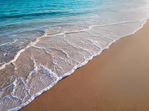 Serene natuurfotografie van kristalheldere turquoise golven die zachtjes het goudbruine zandstrand oprollen tijdens zonsopgang. De schuimende branding creëert een prachtig lijnenspel op het verlaten strand, perfect voor sfeervolle reisfoto's of ontspannende wanddecoratie in coastal style.