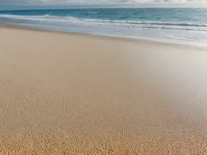 Sereen zeelandschap met maagdelijk goudkleurig zand en turquoise golven die rustig op het strand rollen. De horizon waar lucht en zee elkaar ontmoeten creëert een rustgevend panorama, perfect voor achtergronden of toeristische promotie. Deze strandscène straalt pure rust en natuurlijke schoonheid uit.