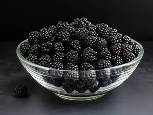 Verse bramen in glazen schaal - donkere food fotografie AI-gegenereerd