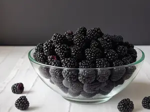 Verse bramen in glazen schaal op witte houten tafel - food fotografie AI-gegenereerd