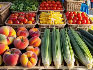 Verse groenten en fruit op boerenmarkt: perziken, tomaten en mais AI-gegenereerd