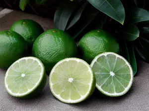 Sfeervol stilleven van verse, sappige limoenen met drie perfect gesneden helften op de voorgrond. De heldergroene schil en het sappige vruchtvlees worden geaccentueerd door decoratieve groene bladeren op de achtergrond. Ideaal voor culinaire content, cocktailrecepten of gezonde leefstijl artikelen.
