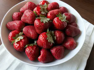 Weelderige compositie van perfect rijpe, helderrode aardbeien, kunstig gepresenteerd in een strakke witte schaal op een licht servet. De glanzende vruchten met hun frisgroene kroontjes stralen versheid uit en nodigen uit tot direct gebruik in desserts of als gezonde snack. Ideaal voor culinaire presentaties en food styling.