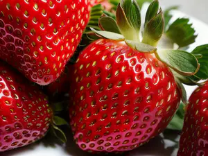 Sappige, rijpe aardbeien in een perfecte macro-opname die de natuurlijke textuur en glans van het fruit benadrukt. De helderrode kleur en karakteristieke zaadjes zijn prachtig zichtbaar, terwijl het frisse groene kroontje de natuurlijke versheid benadrukt. Ideaal voor culinaire websites, gezonde voeding campagnes of foodmarketing.