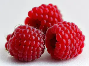 Haarscherpe close-up van drie sappige, helderrode frambozen tegen een zachtwitte achtergrond. De natuurlijke structuur van het fruit is perfect vastgelegd, waarbij elk individueel vruchtbolletje zichtbaar is. perfect voor gebruik in culinaire context, gezonde voeding campagnes of foodblog illustraties.