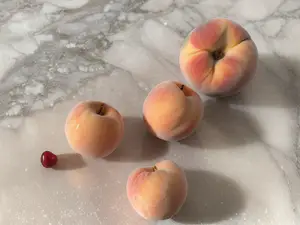 Stijlvolle compositie van sappige witte perziken en een enkele rode kers op een elegant marmeren ondergrond. De zachte perzikkleurige tinten contrasteren prachtig met het witte marmer, wat deze foto perfect maakt voor culinaire content, food marketing of interieurontwerp.