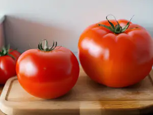 Deze afbeelding toont verse tomaten in verschillende maten op een houten snijplank. Perfect voor culinaire toepassingen, recepten of voedselblogs. Download nu voor een frisse en smakelijke uitstraling in uw project!
