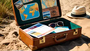 Sfeervolle compositie van een klassieke bruinleren koffer op het strand, gevuld met reisbenodigdheden zoals een wereldkaart, zonnebril en reisdocumenten. Een stijlvolle panama hoed maakt het plaatje compleet. perfect voor reisbureaus, toeristische websites of vakantie-inspiratie op social media.