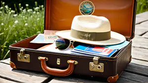 Sfeervolle compositie van een klassieke bruinleren koffer met essentiële vakantie-items: een elegante witte strohoed met grijs lint, stijlvolle zonnebril en reisdocumenten. De vintage uitstraling wordt versterkt door het warme zonlicht en wilde bloemen op de achtergrond, wat een nostalgisch vakantiegevoel oproept.