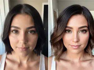 Indrukwekkende beauty transformatie die de kracht van professionele make-up en haarstyling laat zien. De foto toont een voor- en na vergelijking met subtiele make-up, perfect gestylede wenkbrauwen en een elegant golvend kapsel. perfect voor beauty professionals en visagisten.