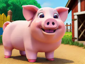 Schattig geanimeerd varkentje in vrolijke 3D-stijl, perfect voor kinderboeken en educatieve materialen. Het roze biggetje staat op een zonnige boerderij met schuur en houten hek op de achtergrond. De expressieve tekenstijl en warme kleuren maken deze illustratie ideaal voor kinderprojecten en educatieve toepassingen.