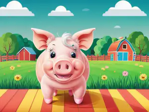 Schattige illustratie van een vrolijk roze varkentje op een kleurrijke boerderij. De cartoon toont een zonnige landelijke setting met rode schuren, bloemen en een stralend blauwe lucht. perfect voor kinderkamerdecoratie of educatief materiaal over boerderijdieren. De warme kleuren en vriendelijke stijl maken deze afbeelding aantrekkelijk voor jo...