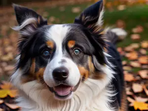 Expressief portret van een vrolijke Australian Shepherd met opvallende ijsblauwe ogen en een karakteristieke driekleurige vacht. De hond ligt tussen gevallen herfstbladeren en kijkt met een vriendelijke, open blik direct in de camera. De scherpe detailfoto toont de prachtige vachttekening en intelligente uitstraling van dit populaire hondenras.