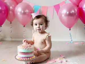 Feestelijke cake smash fotoshoot met zachte roze en fuchsia ballonnen tegen een lichte achtergrond. Een kleurrijke verjaardagstaart in pastelroze en wit staat centraal, omringd door vrolijke slingers en vlaggetjes. De perfecte setting voor een onvergetelijke eerste verjaardag en professionele fotoshoot.