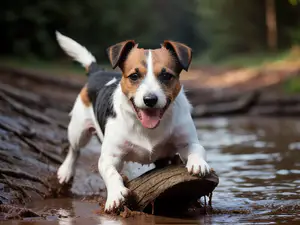 Energieke Jack Russell Terriër die enthousiast met een boomstam speelt in ondiep water. De driekleurige vacht en vrolijke uitdrukking van de hond zijn perfect vastgelegd tegen een natuurlijke achtergrond. Een authentiek moment van hondenplezier dat perfect geschikt is voor dierenwebsites of huisdierencontent.