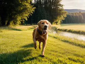 Energieke Labrador in volle beweging vastgelegd tijdens een mooie zomeravond. De warme zonnestralen verlichten het goudgele gras, terwijl op de achtergrond een serene waterkant en bosrand te zien zijn. perfect voor content over huisdieren, natuurbeleving of outdoor activiteiten met honden.
