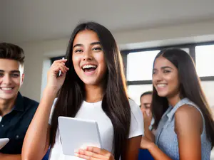 Dynamische studieomgeving waar jonge mensen enthousiast samenwerken met moderne technologie. De natuurlijke interactie en opgewekte sfeer maken dit perfect voor onderwijsgerelateerde content, studentenwerving of artikelen over modern onderwijs en digitaal leren.