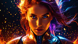 Spectaculair fantasy portret waarin vuur en ijs samenkomen in een explosie van kleur. De dramatische belichting creëert een intens contrast tussen warme oranje en koele blauwe tinten. Perfecte stockfoto voor gaming, fantasy of science fiction projecten. De futuristische setting wordt versterkt door vonken en lichteffecten.