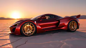 Een schitterende metallic rode hypercar met luxe gouden velgen staat op de gebarsten oppervlakte van een uitgestrekte zoutvlakte. De zon daalt net achter de bergketen aan de horizon, waardoor een warme gouden gloed over het landschap valt. De vloeiende lijnen van de auto contrasteren prachtig met het natuurlijke geometrische patroon van de zoutkorst, terwijl de lage zonnestralen glinsteren op zowel de glanzende carrosserie als het kristallijne oppervlak.