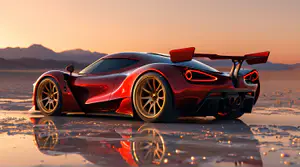 Een schitterende metallic rode hypercar met imposante achtervleugel en gouden velgen staat op een natte zoutvlakte tijdens zonsondergang. De spiegelende ondergrond creëert een perfecte reflectie van zowel de auto als de warme avondlucht. De oranje-roze gloed van de ondergaande zon achter de bergsilhouetten baadt de hele scène in een magisch licht, terwijl de ronde achterlichten oplichten tegen de schemering.