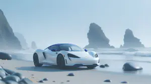 Afbeeldingen - https://afbeeldingen.net/ai/witte-sportwagen-op-mistig-oceaanstrand--292552c