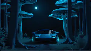 Een glanzende witte supercar met blauwe verlichting staat op een bospad omringd door enorme, lichtgevende paddenstoelen met brede hoeden. De gigantische bioluminescente zwammen verlichten het nachtelijke tafereel in een etherisch blauw licht, terwijl de volle maan aan de donkere hemel schijnt. De combinatie van futuristische auto en fantasierijke omgeving creëert een magische sfeer die doet denken aan een andere wereld.