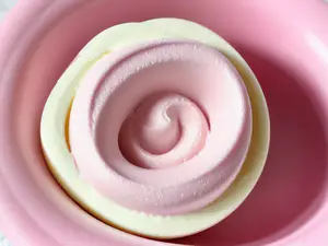 Artistieke close-up van een perfect gedraaide roze mousse spiraal met zachte pastelkleurige tinten. De romige textuur en het subtiele kleurverloop van roze naar roomwit creëert een verleidelijke en elegante dessertfotografie, ideaal voor culinaire presentaties en patisserie marketing.