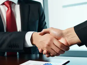 Professionele handdruk tussen zakenpartners in een moderne kantooromgeving. Ideaal voor gebruik in zakelijke contexten zoals samenwerking, onderhandelingen en overeenkomsten. Laat uw bedrijf groeien met deze krachtige visuele boodschap.