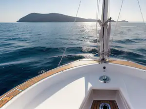 Sfeervolle foto vanaf de boeg van een luxe zeilboot, met zicht op een bergachtig eiland in de verte. Het teakhouten dek en de witte romp stralen elegantie uit. De kalme azuurblauwe zee en het heldere weer maken het plaatje compleet voor een perfecte dag op het water. Ideaal voor maritieme promotie of vakantiesfeer.
