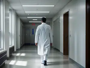 Ziekenhuisgang met medisch personeel in karakteristieke witte jas AI-gegenereerd