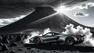 Zilvergrijze Hypercar met Rode Accenten voor Majestueuze Vulkaan in Zwart-Wit AI-gegenereerd