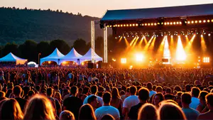 Sfeervol beeld van een drukbezocht zomerfestival tijdens zonsondergang. Het imposante podium met professionele lichtshow en stretchtenten creëert een magische festivalsfeer. De grote mensenmassa geniet van het concert terwijl de zon achter de beboste heuvels zakt. perfect voor promotie van evenementen, festivals of entertainment-gerelateerde con...