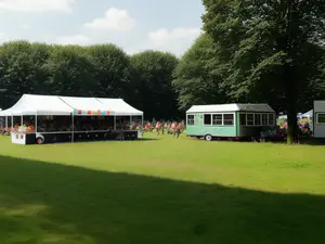Sfeervolle festivalopstelling in een groene omgeving met professionele cateringfaciliteiten. Een ruime witte partytent en mintgroene foodtruck staan opgesteld op een uitgestrekt grasveld, omringd door volgroeide bomen. perfect voor zomerse buitenevenementen, festivals en openluchtfeesten waar catering een centrale rol speelt.