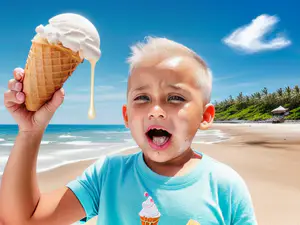 Vrolijke zomersfeer op een tropisch strand met een smeltend vanille-ijsje in een knapperig hoorntje. De blauwe lucht, wuivende palmbomen en het goudgele zand creëren een perfect vakantieplaatje. Het smeltende ijs vangt het ultieme zomergevoel en de onbezorgde vakantiestemming.
