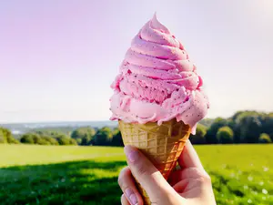 Afbeeldingen - https://afbeeldingen.net/ai/zomers-roze-softijs-in-hoorntje-tegen-gr-1bf0d2c