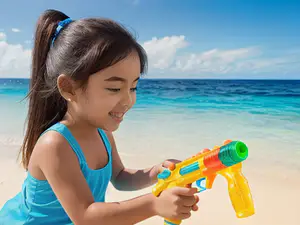 Zomers strandplezier met kleurrijk waterpistool aan tropische kust AI-gegenereerd