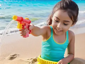 Vrolijke zomersfeer op het strand met een kleurrijk waterpistool in rood en geel. De turquoise zee en het goudgele zand creëren een perfecte vakantiesfeer. Ideaal voor advertenties over zomervakantie, strandplezier of kinderspeelgoed. De natuurlijke belichting en spontane sfeer maken deze foto authentiek.