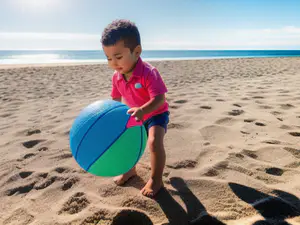 Vrolijke zomerdag op het strand vastgelegd in een spontaan speelmoment. Een kleurrijke blauw-groene strandbal zorgt voor eindeloos speelplezier op het warme strandzand. De stralende zon en azuurblauwe zee vormen het perfecte decor voor een onbezorgde dag aan de Nederlandse kust.