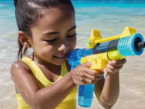Vrolijke zomerse sfeer met een kind dat geniet van waterpret aan het strand. Het felgele en blauwe waterpistool zorgt voor eindeloos speelplezier tegen de achtergrond van kristalhelder turquoise water. perfect beeld voor advertenties van strandspeelgoed of zomerse vakantiebestemmingen.