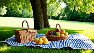 Sfeervolle picknickscène in een zonnig park met klassieke rieten manden op een blauw-wit geruit kleed. De setting wordt verrijkt met vers fruit waaronder appels, druiven en sinaasappels. Het zachte zonlicht door de bladeren van een majestueuze boom creëert een warme, uitnodigende sfeer perfect voor lifestyle en culinaire content.