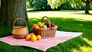 Sfeervolle picknickopstelling in een zonovergoten park met twee authentieke rieten manden op een klassiek rood-wit geblokt kleed. De manden zijn gevuld met een kleurrijke selectie vers fruit waaronder sappige sinaasappels, groene appels en rode druiven. perfect voor lifestyle content en zomerse marketingcampagnes.