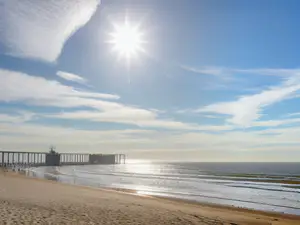Zonnige stranddag aan de Noordzee met pier in de verte bij zonsopgang AI-gegenereerd